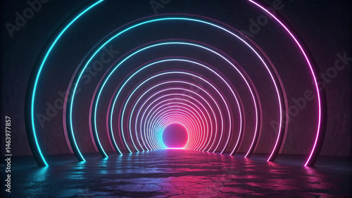© Muhammad, Fototapeta premium Neon lights tunnel background with glowing circles and reflections for futuristic design 3d rendering