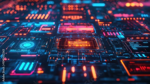Obraz premium Neon lines and HUD interface elements, with futuristic 3D layers showcasing abstract digital data