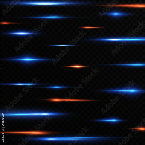 © kulinskaia, Obraz premium Neon lines moving light effect. Horizontal lines. Speed ​​effect on a transparent background. Lines of light, speed and movement. blue and red.