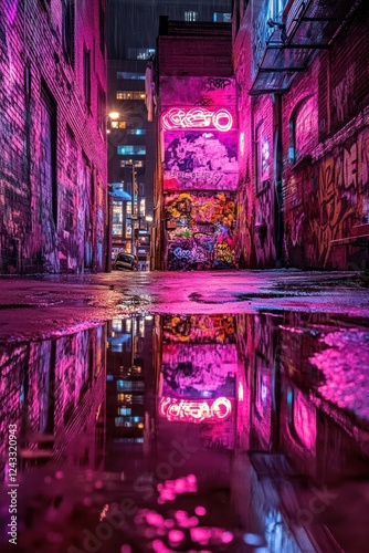 Fototapeta premium Neon-lit alleyway, graffiti art, city night reflection, urban background,...