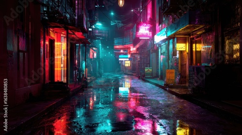 © Stocklyn, Fototapeta premium Neon-lit alleyway, night rain, city, reflections, cyberpunk backdrop, video game