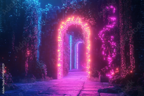 Fototapeta premium Neon Lit Archway Pathway Through Futuristic Garden