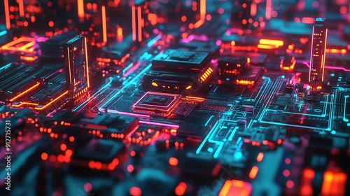 © Budi, Fototapeta premium Neon-lit circuit boards creating a cityscape