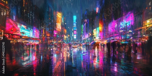 © Murda, Fototapeta premium Neon-lit city street with rain and people.