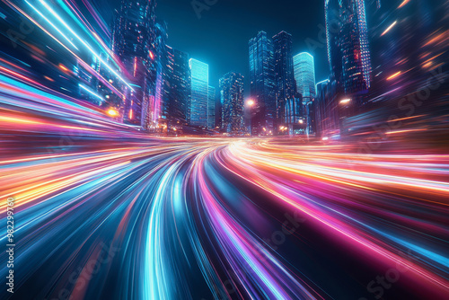 Fototapeta premium Neon-lit city streets with futuristic motion blur and glowing light trails at...