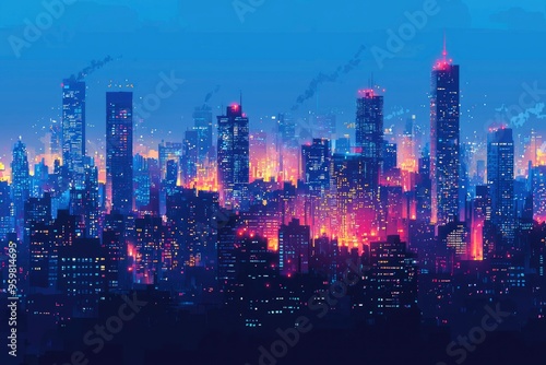 Fototapeta premium Neon-Lit Cityscape with Illuminated Windows and Skyscrapers at Dusk