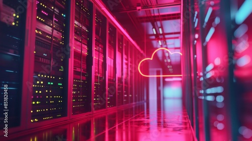 Fototapeta premium Neon-lit cloud computing data center with servers showing modern technology...