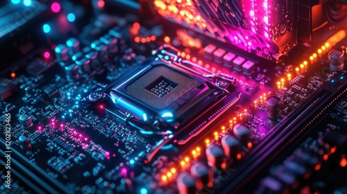 © Ali, Fototapeta premium Neon-lit computer motherboard, CPU installed.