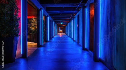 Fototapeta premium Neon-lit corridor with blue and pink lighting.