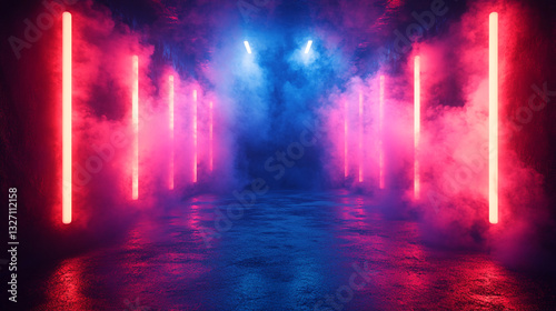 © harekrishnajoyradha, Obraz premium Neon-Lit Corridor with Pink and Blue Fog. ai generated