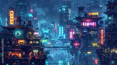 Obraz premium Neon-Lit Cyberpunk Cityscape Under Night Rain