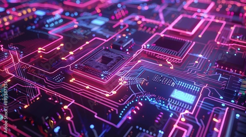 Obraz premium Neon-lit digital circuit board with intricate patterns Tech