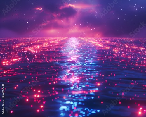 © Thares2020, Obraz premium Neon Lit Digital Lake with Mesmerizing Landscape and Glowing Patterns