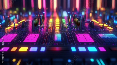 © YudhoStd, Obraz premium Neon Lit Dj Mixer Control Panel Synth
