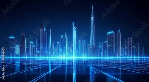 Fototapeta premium Neon-lit futuristic cityscape with skyscrapers and grid lines