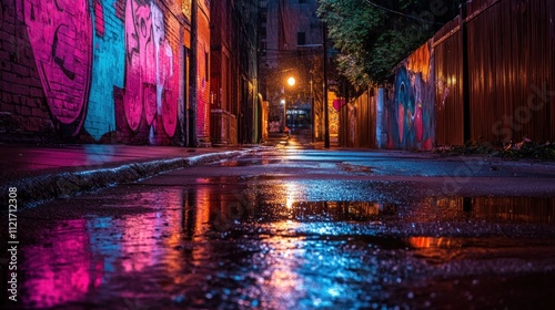 © Ali, Obraz premium Neon-lit graffiti alley, rain-slicked street reflections.