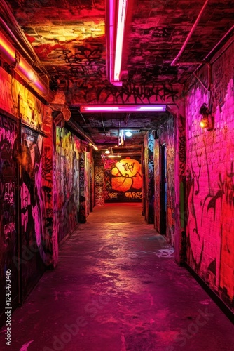 Fototapeta premium Neon-lit graffiti hallway, urban exploration, vibrant background, perfect for...