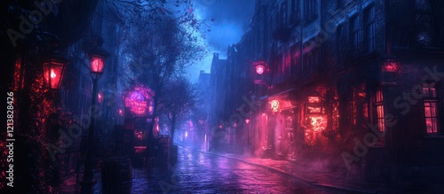 Obraz premium Neon-lit Night Street, Foggy, Rainy