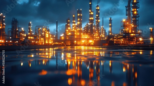 Naklejka premium Neon-lit oil refinery at night, industrial glow reflecting on a metallic surface