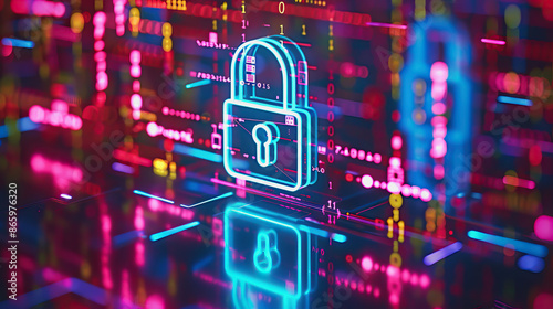 © Jirapong, Obraz premium Neon-lit padlock with data lines and binary code in digital space