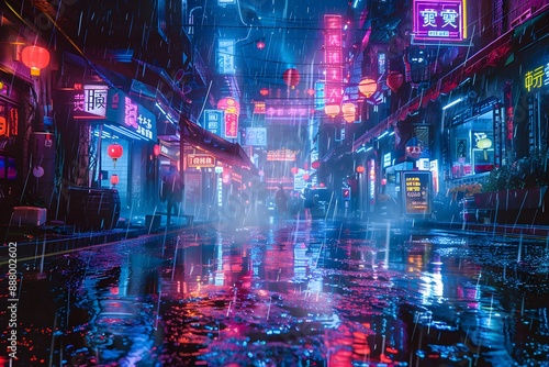 © Cris, Naklejka premium Neon-Lit Rainy Street in a Futuristic Cityscape