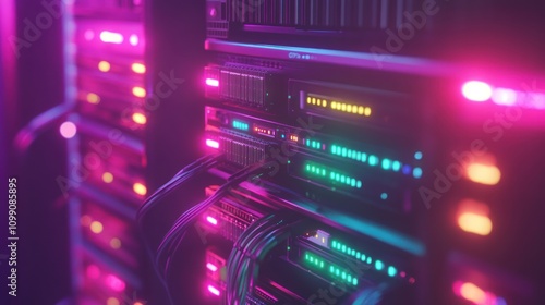 © Egriva, Obraz premium Neon-lit server rack in data center.