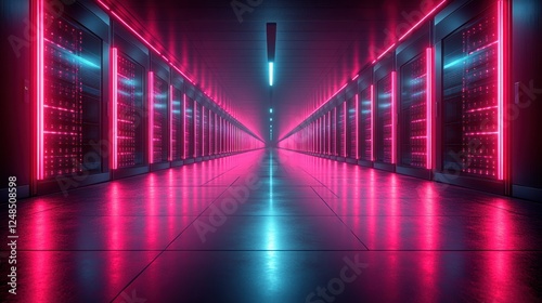 Fototapeta premium Neon-lit server room corridor, data center, digital future