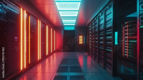 Fototapeta premium Neon-lit server room hallway. Futuristic data center.