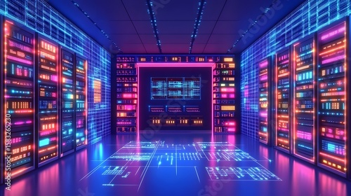 © Jojo*, Obraz premium Neon-lit server room with glowing technology.