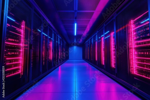 Fototapeta premium Neon-lit server room with glowing technology racks