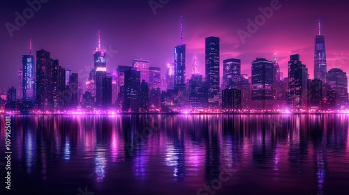 Fototapeta premium Neon-Lit Skyscrapers Reflecting in a City's Waterscape