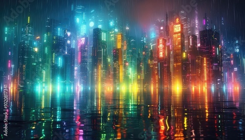 © boler, Obraz premium Neon-Lit Skyscrapers Reflecting in a Rainy City