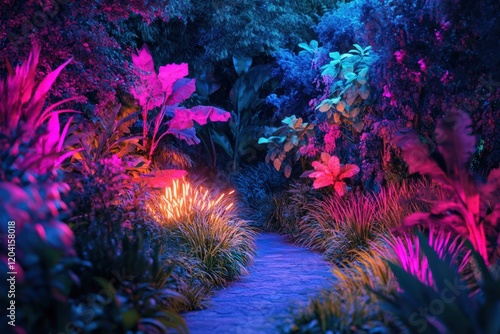 © arri, Obraz premium Neon Lit Tropical Path Through Lush Foliage
