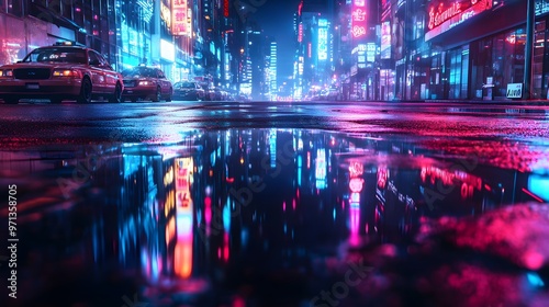 Obraz premium Neon-lit urban street with reflections in puddles.