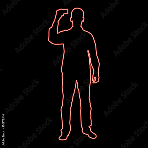 Fototapeta premium Neon man shows card in his hand business card in hand businessman silhouette icon red color vector illustration image flat style