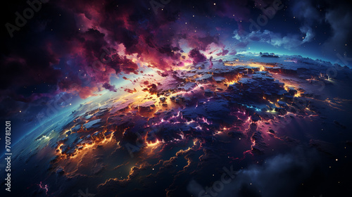 Fototapeta premium Neon map of the world seen from space, taken from a high angle