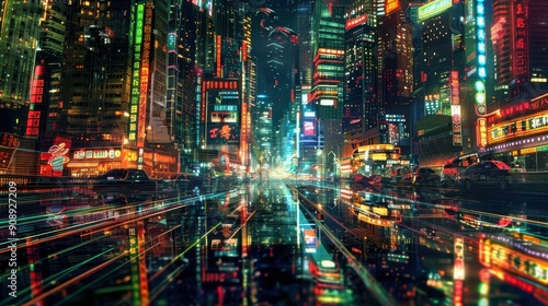 Obraz premium Neon Metropolis: Futuristic Cityscape with Reflective Surfaces, Towering Buildings, and Vibrant Light Trails