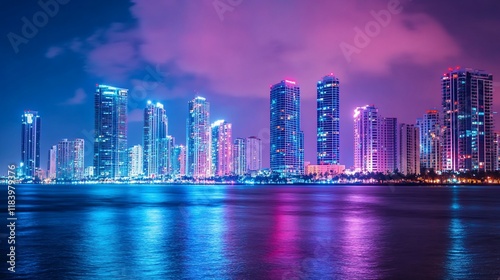 © afif, Obraz premium Neon Miami skyline night cityscape reflection