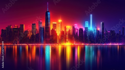 © arpln, Fototapeta premium Neon NYC skyline reflected in water at night