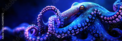 © Oleksandr, Obraz premium Neon octopus tentacles glowing in the depths of a dark sea.