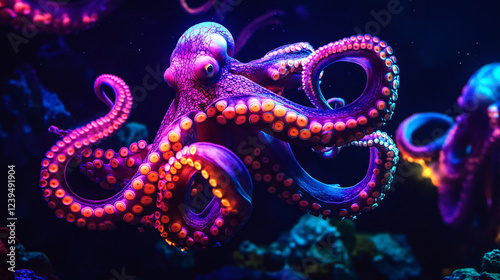 © Oleksandr, Fototapeta premium Neon octopus tentacles glowing in the depths of a dark sea.