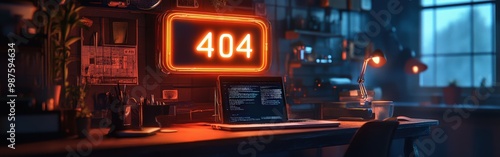 Obraz premium Neon "404 Page Not Found" Sign with Digital Server Background for Tech Concept
