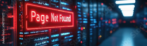 © gen_pick, Obraz premium Neon "404 Page Not Found" Sign with Digital Server Background for Tech Concept