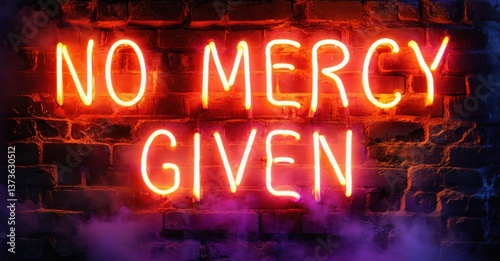 © antishock, Obraz premium Neon phrase no mercy given in orange and violet glowing thick font above bricks with mist grime and subtle light leaks