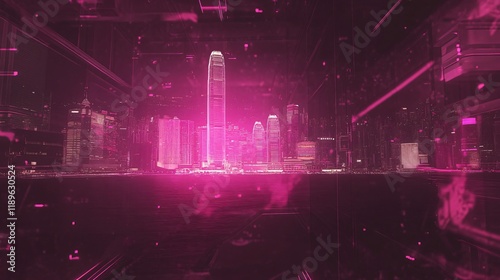 © Fozle, Fototapeta premium Neon Pink Cityscape at Night Futuristic Hong Kong Skyline