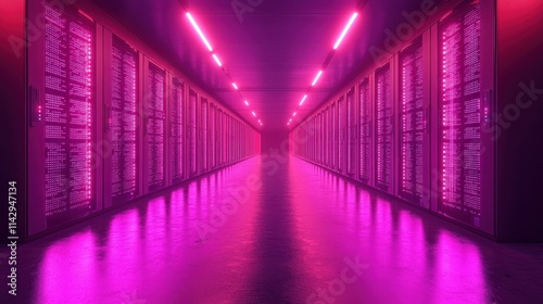 Fototapeta premium Neon Pink Data Center Aisle with Bright Lighting