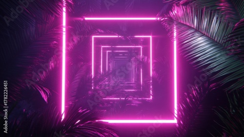 © vectcore, Fototapeta premium Neon pink square tunnel in a tropical jungle with palm leaves and futuristic ambiance