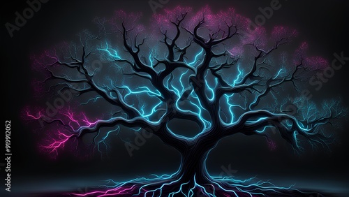 © Ahsan Ali, Obraz premium Neon Plexus Oak Tree: High-Quality Digital Desktop Wallpaper with Stunning, Trendy Black Background Design