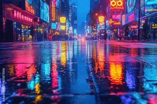 © Dennis, Fototapeta premium Neon Reflections Illuminate City Streets at Dusk