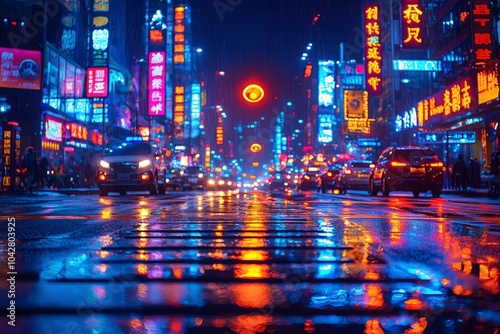 © Outkast, Naklejka premium Neon Reflections on Wet Pavement in a Rain-Soaked Cityscape
